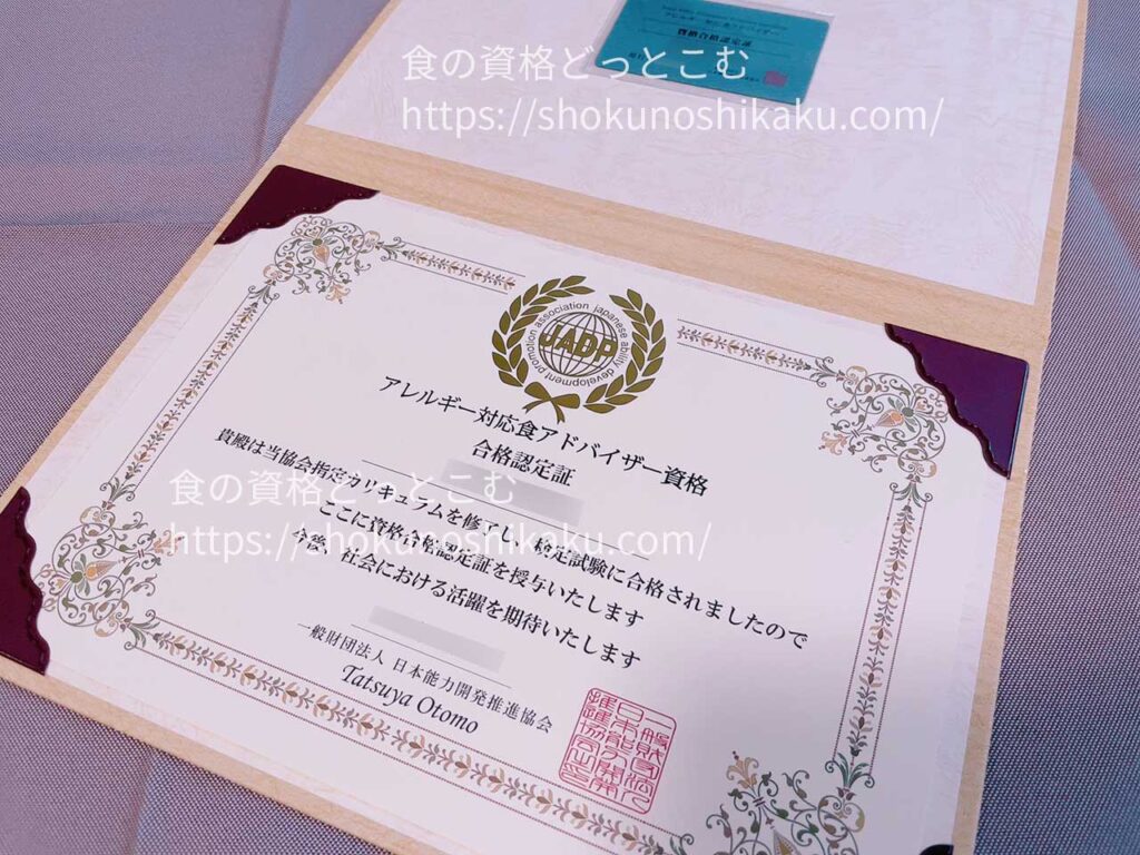 - アレルギー対応食アドバイザー資格の認定証のクオリティが高い