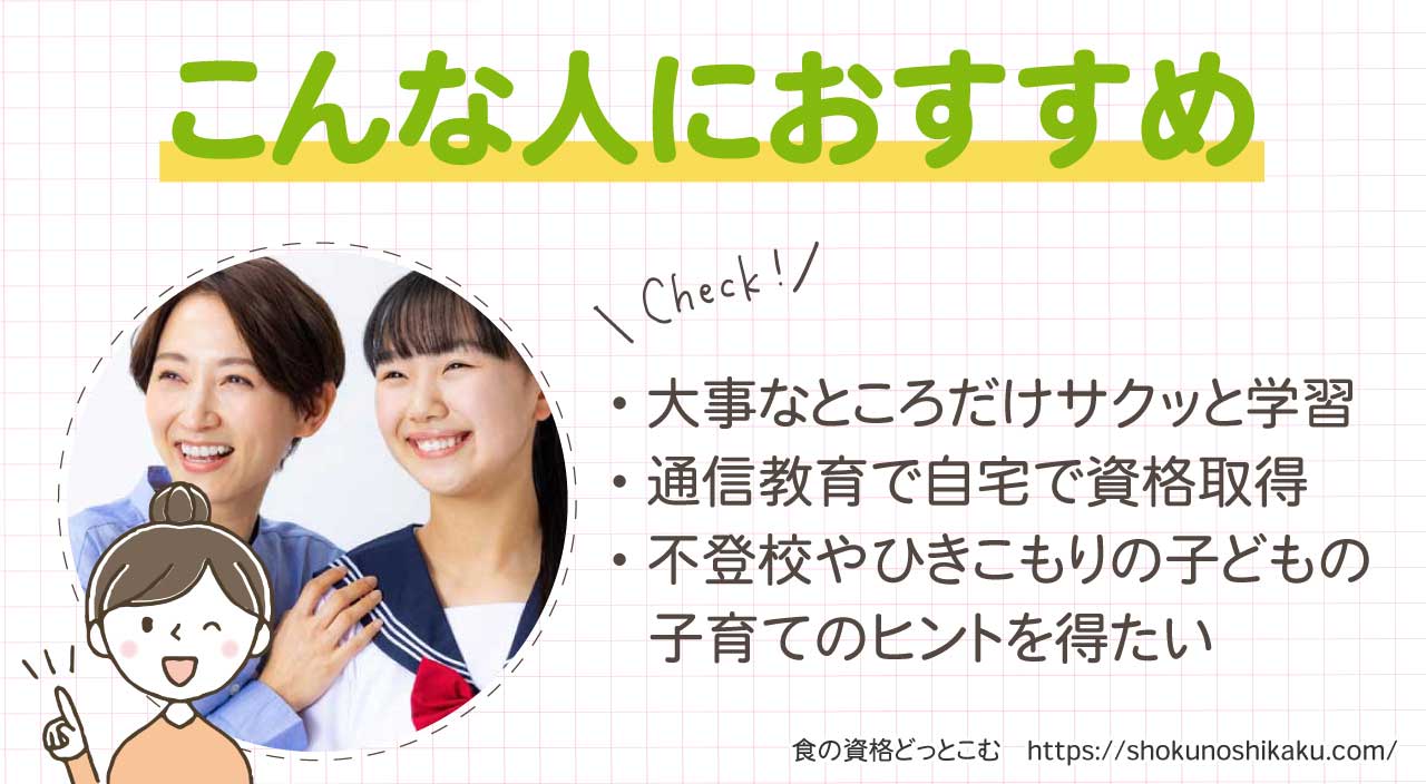 プロの指導を受けながら、不登校やひき子もりの子どもの支援、接し方のコツに関する本当に必要な知識だけを、効率よく学びたい人におすすめです。